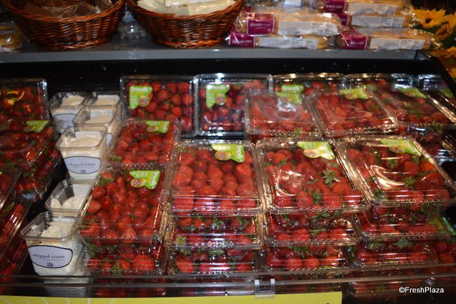 Close-up of the large clamshells with strawberries. These large clamshells are very common during the peak season.