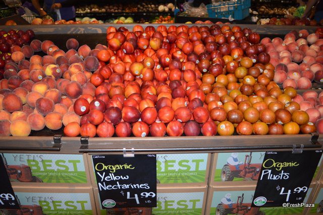 This store carries a large selection of organic stone fruit. Pictured from left to right are red plums, yellow peaches, yellow nectarines, pluots and white peaches.