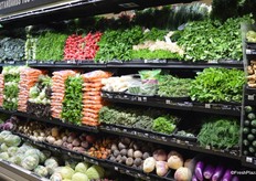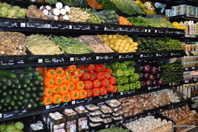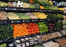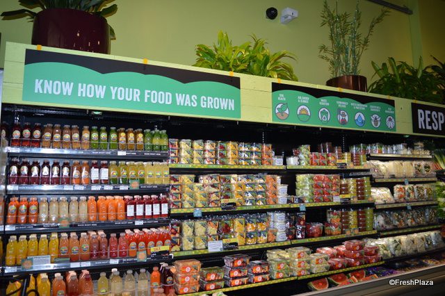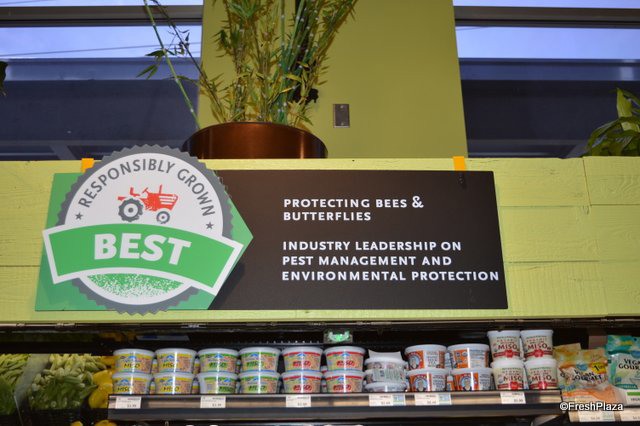 Juices and pre-cut fruit and vegetables. This is where the Responsibly Grown signage starts.