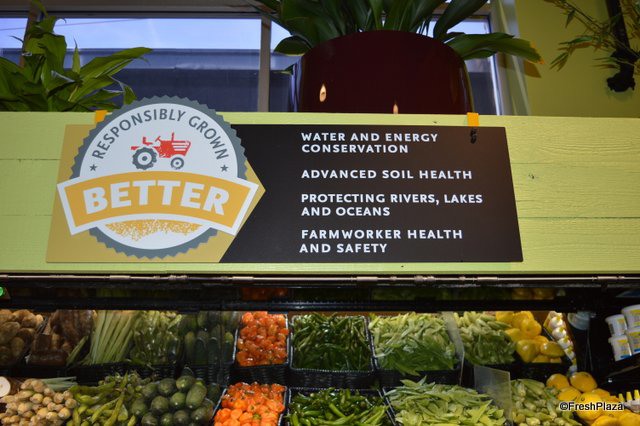Vertical merchandising on the side and education for the customer regarding the grocer's Responsibly Grown program.