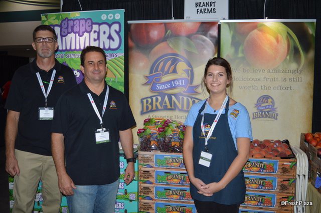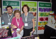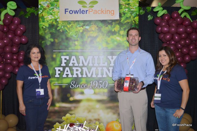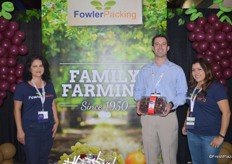 Liz Rodriguez, Kevin Souza and Kristy Marthedal of Fowler Packing. Kevin shows a 4lb clamshell with grapes, primarily sold at warehouse stores.