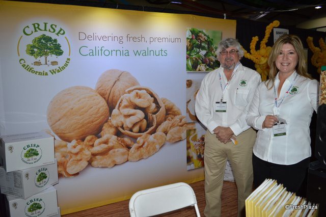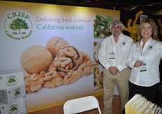 Jim Crisp and Diana Peck with Crisp California Walnuts. A walnut dispenser in the booth offered attendees opportunities to try.