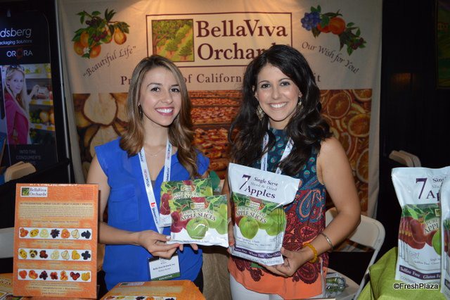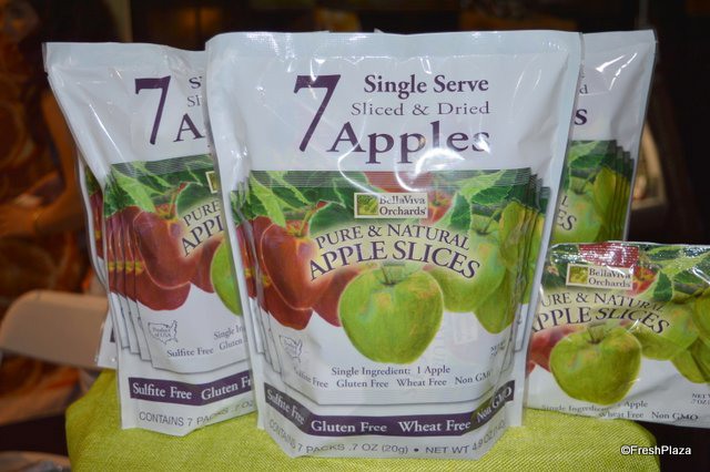 Kelsey Nunes and Brean Bettencourt with BellaViva Orchards, showing their new product: dried apple slices.