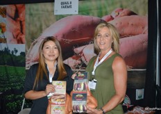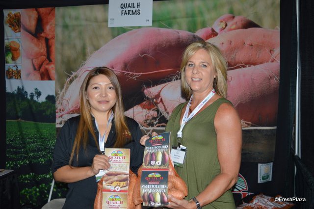 Angie Maciel and Larelle Miller with Quail H Farms, showing sweet potatoes in new high-graphic bags.
