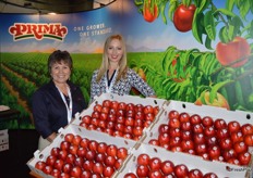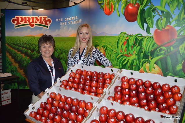 Idalia Alanis and Victoria Simas with Gerawan Farming, showing peaches and nectarines.