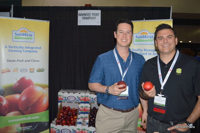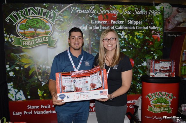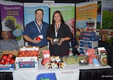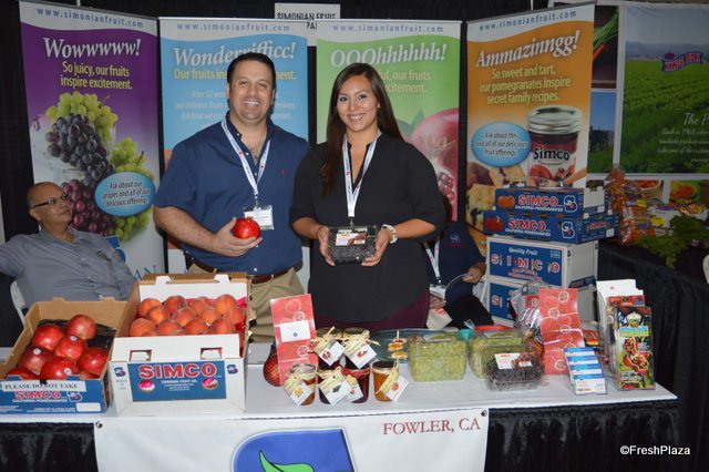 Jeff Simonian and Kristin Lopez with Simonian Fruit Company. The company has a large selection of Central Valley-grown fruit on display in the booth.