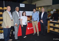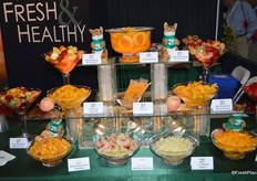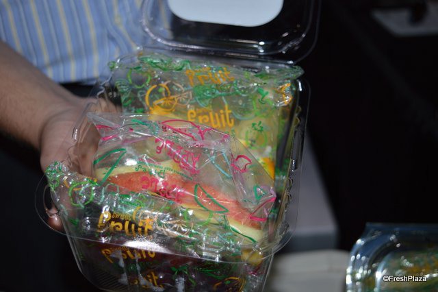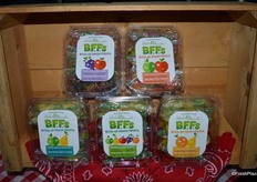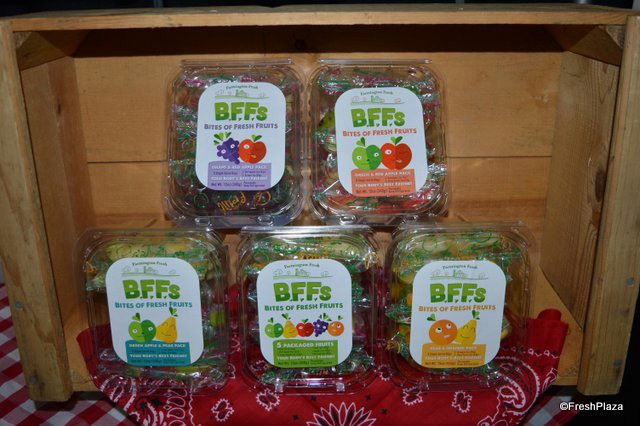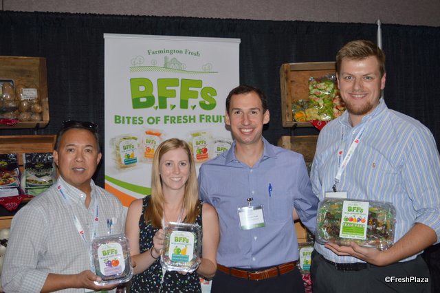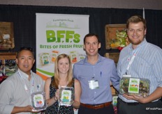 The team of Farmington Fresh: Ernie Pascua, Jennifer Lima, Garrison Rajkovich and Daniel Rajkovich. They show a new product: Bites of Fresh Fruits. Each clamshell contains individually packaged bags with pre-cut fruit.