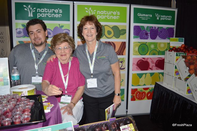 Manny Ramos, Helen Krause and Kellee Harris with Giumarra Companies. Mrs. Krause, a retired plum grower, makes a delicious plum pie and had show attendees taste the pie ingredients in the booth.