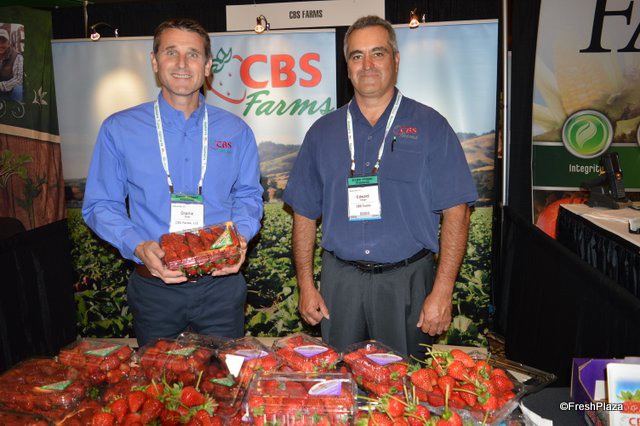 Charlie Staka and Edward Ortega with CBS Farms, proudly showing strawberries,