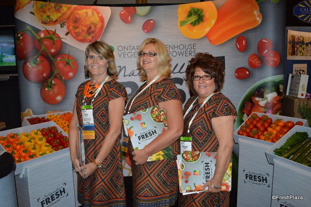 Uniformity and smiles in the booth of the Ontario Greenhouse Vegetable Growers. From left to right: Nancy Hewitt, Fiona McLean and Margaret Wigfield.