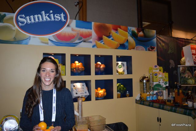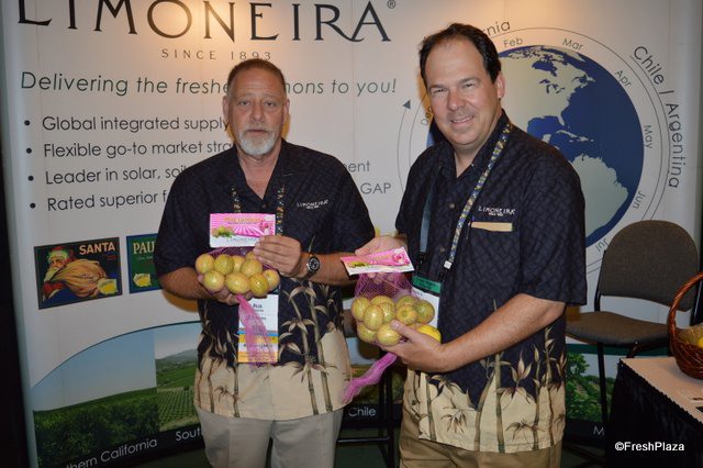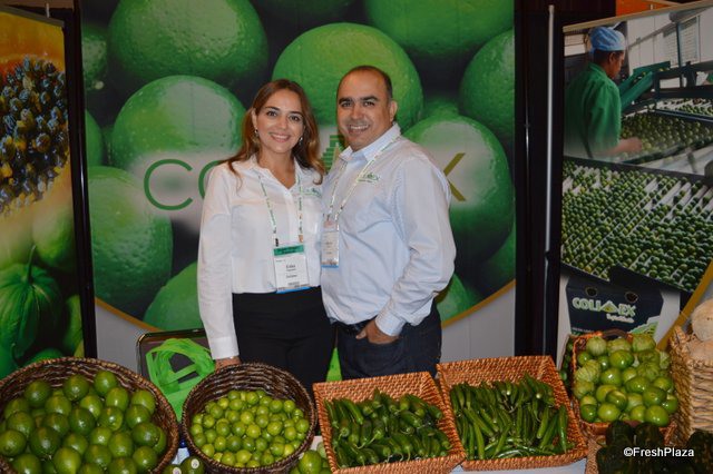 Limes, key limes, peppers and coconuts from Mexico on display in the Colimex Tropical Fruit booth, represented by Erika Anguiano and Antonio Gudino.