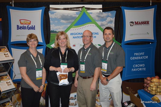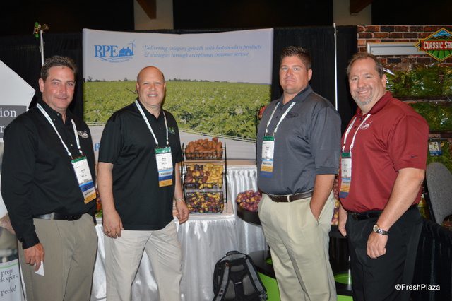Different kinds of potatoes on display in the booth of RPE Spud. From left to right David Hagar, Mike Shamberg, Dave Phillips and Kevin Wright.