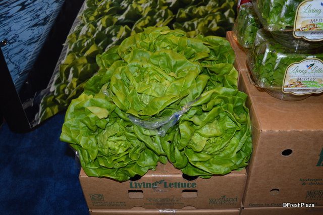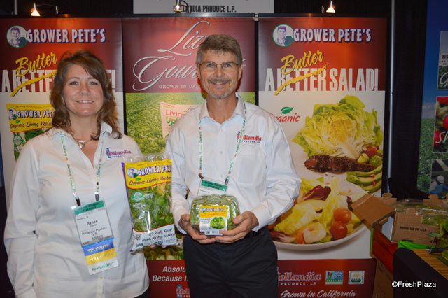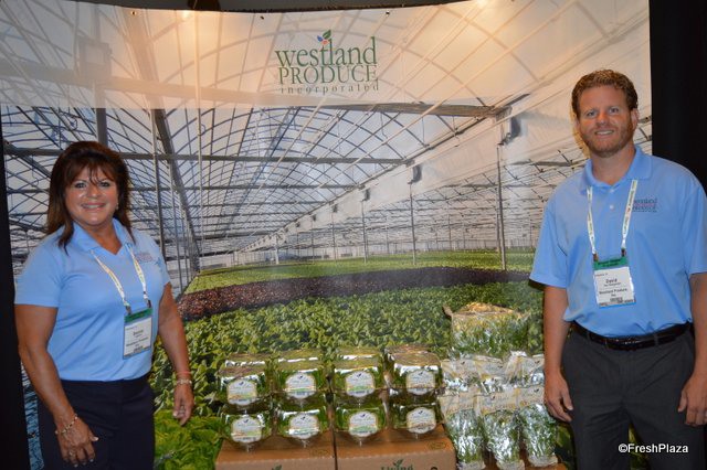 Denise Leonard and David VanWingerden with Westland Produce, showing living lettuce products.