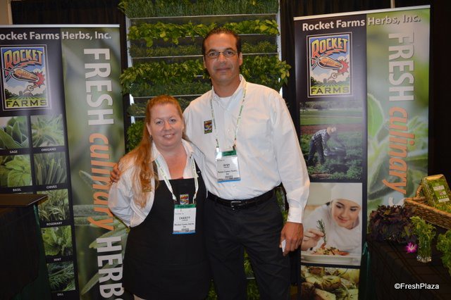 Charity Carson and Jorge Michael with Rocket Farms, standing in front of a large display of herbs.