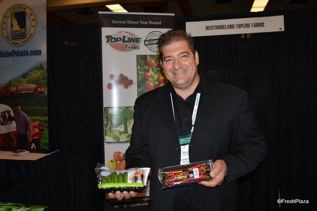 Dino Dilaudo with Westmoreland/TopLine Farms proudly shows a new product: hot peppers. The mini cocktail cucumbers are in their first season, so a relatively new product as well.