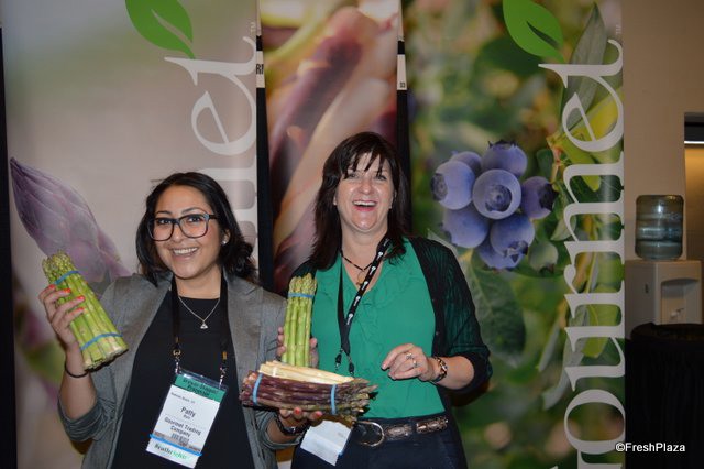 Happy faces in the booth of Gourmet Trading. Patty Ruiz and Kristen Francisco proudly show green, white and purple asparagus.