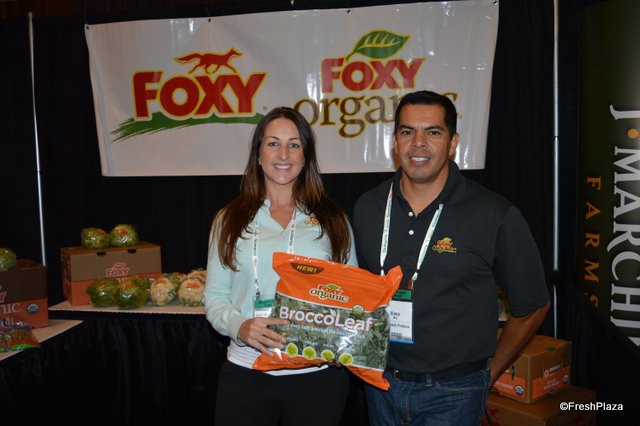 Kristin Shafer and Vince Mier with Foxy Produce showing their new product Broccoleaf. Broccoleaf are the outer leaves of the broccoli plant.