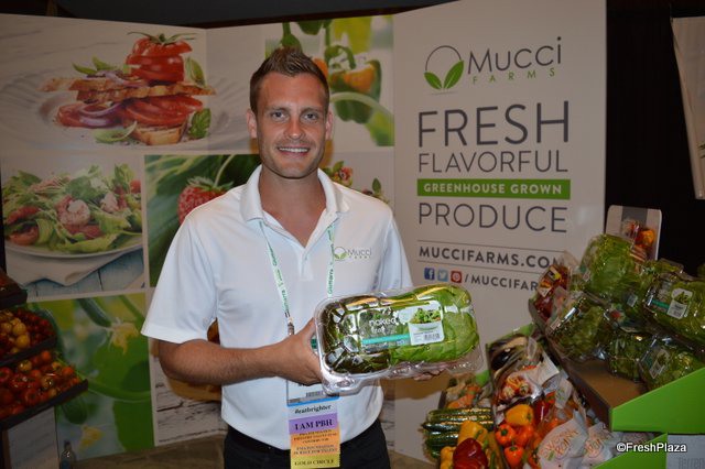 Nick Williamson with Mucci Farms, proudly showing Naked Leaf lettuce.