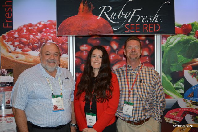Gunner White, Jeri Elasser and Dennis Surabian with Trinity Fruit Sales, showing a new product: frozen pomegranate arils.