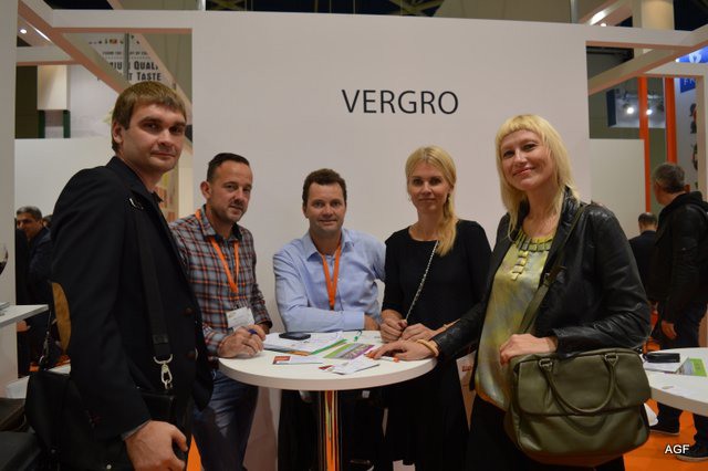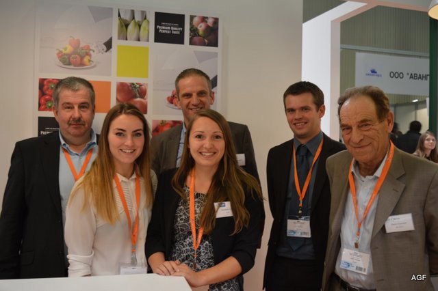 Vergro specializes in tomatoes, leek, lettuce, strawberries, apples and pears. Second from left Geert Schoofs and Dominiek Noppe with Russian clients.