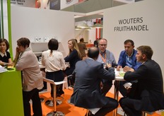 Wouters Fruithandel produces apples and pears. A well-known Wouters Fruit variety is the Celina, with the QTee brand name. Chris and daughter Silke Wouters speaking to clients.