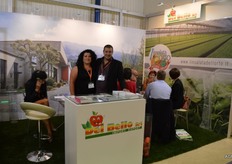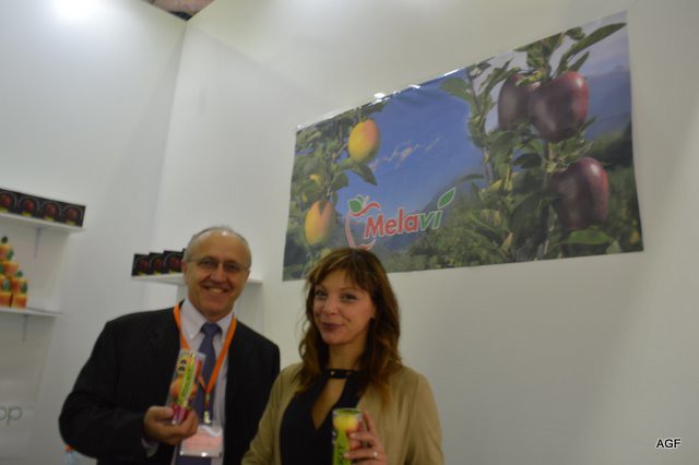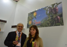 Italian company Melavi. Left Tiziano Caprioli and Elena Picozzi. This company has the licence for Rockit in Italy. Rockit is the New Zealand concept for marketing miniature apples in the 'healthy snack' line. This concept consists of a plastic tube with five small apples in it. These apples are sweet, juicy and crunchy.