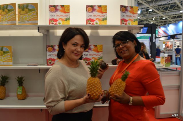 Jardin de St Julien Ltd exports pineapple, passion fruit and tarragon from Mauritius. Right Savy Ramburrun, left Elena Gorlevaya of Fruit Queen from Barendrecht.