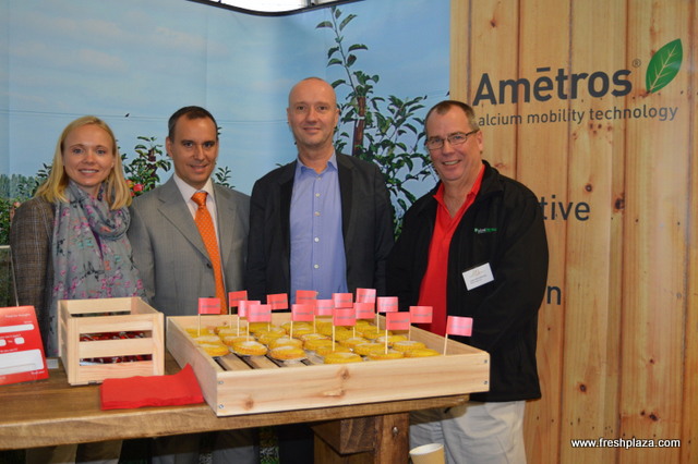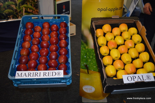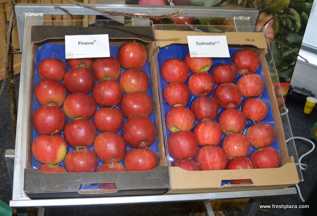 Robert Jarvis from UniVeg tells a visitor all about the new Opal apple which will be on the supermarket shelves on 10th November. The Opal is a yellow variety and he explains that it can be a challenge to get consumers to try it but when they do they are impressed with the taste.