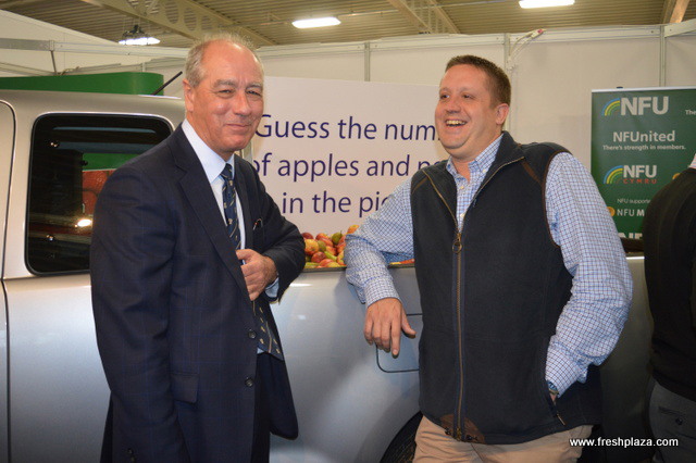 Kevin Attwood, Kent NFU also Kent County Agricultural Society Chairman with Ross Goatham, AC Goatham at the NFU stand who had a competition to guess how many apples were in the pick up.
