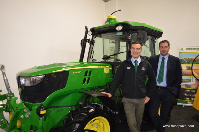 Chris Cormac-Walshe and Andy Page with the 5100 GF John Deere, specially designed for fruit growers with lots of electronic gadgets.
