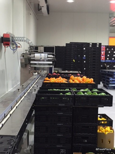 Capsicums going through the sorting and packing process. The capsicums are machine weighed and packaged according to the specifications of each customer. Workers monitor this process and ensure quality control throughout every phase of the process.
