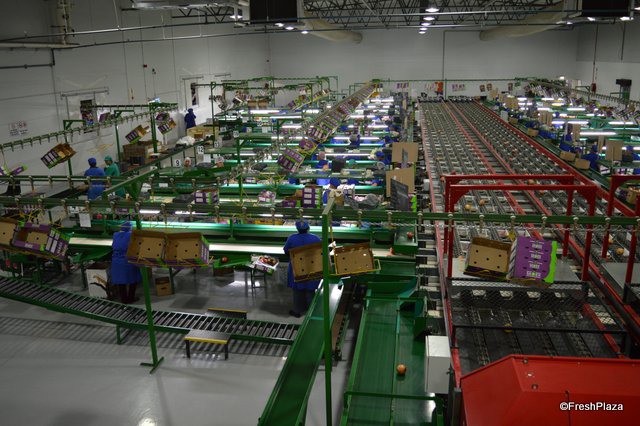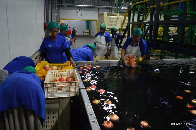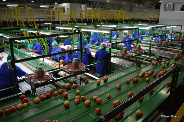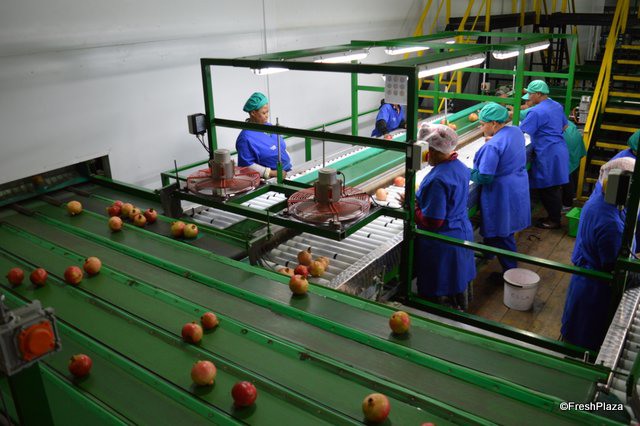 The ladies are putting the pomegranates in by hand because the lines are being cleaned.