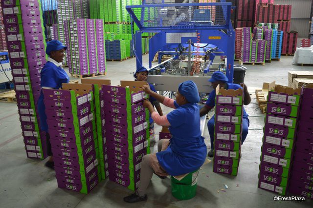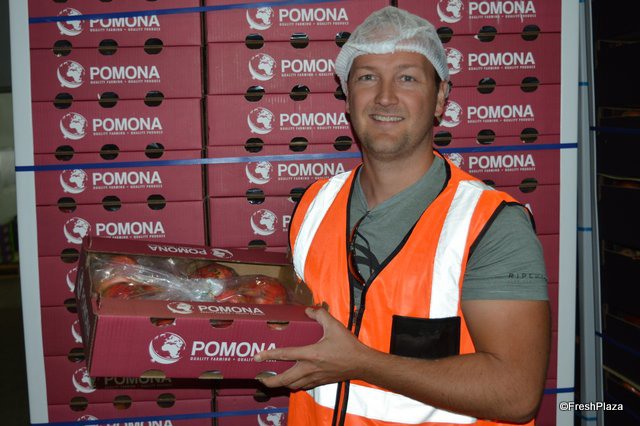 Brent Geddes from Pomona shows his pomegranates which have just been packed.