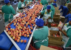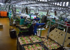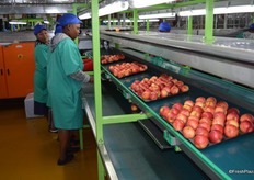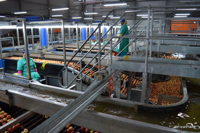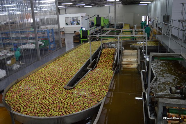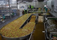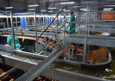 The water transport ends at the rollers where the fruit is checked for quality by the human eye.