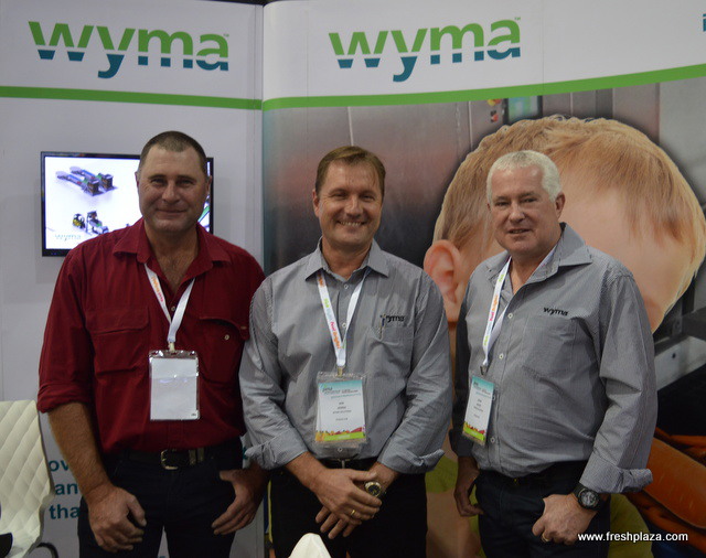 Wyma supply machinery for packing vegetables, including the veg polisher: Bruce Wickham from Wickham Farms with Ian Serra and John Roest from Wyma.