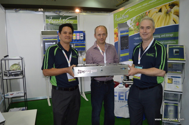 Paul Gapes and Mark Fergusson at Pacific Data with Dimitrios Loutsaris from MiaTech (middle) with a device for airbourne bacteria and ethylene removal.