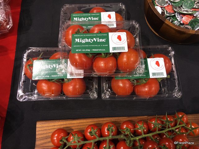 MightyVine's first harvest: Roterno tomatoes on the vine and Robinio cherry tomatoes. The products target the Chicago consumer market and its surroundings.