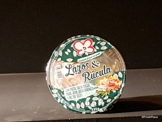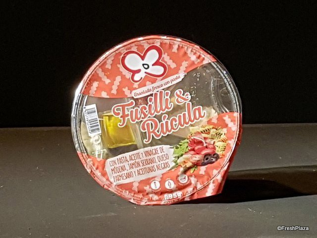 Another innovation of Primaflor is this Fusili & Rúcula, which is only on the market from July this year. It's a salad with rucula, tomatoes, proscuitto, parmesan cheese, olives, balsamic vinegar and oil.