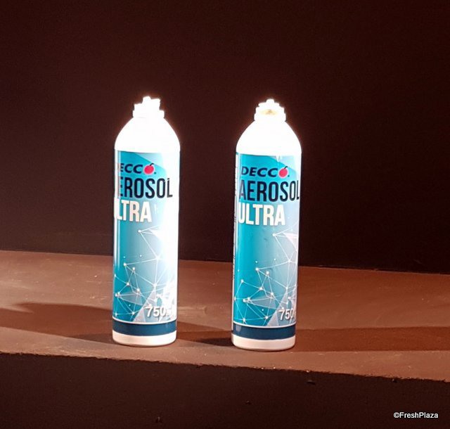 Decco Ibérica post cosecha with the Decco Aerosol Ultra. Decco presented this full-discharge aerosol based on glycolic acid since september this year. It is designed for use as a desinfectant in cold chambers without leaving subsequent waste problem and avoiding crosscontamination.