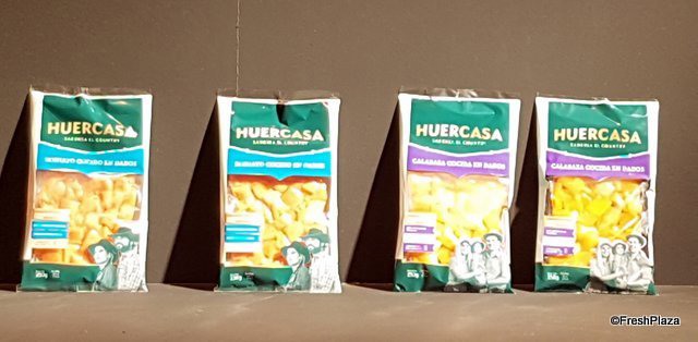Huercasa 5 Gama and baked sweet potato. Sweet potato and pumpkin cooked and peeled, cubed and 100% natural. No additives or preservatives. Both are commercialized since august this year.