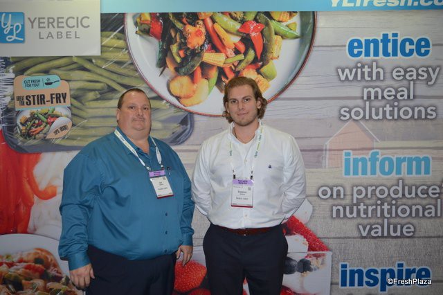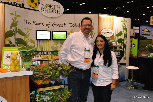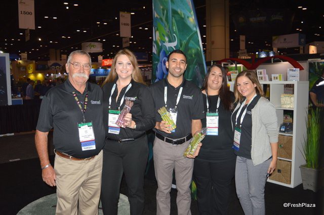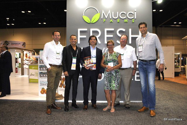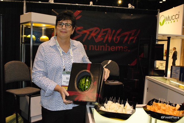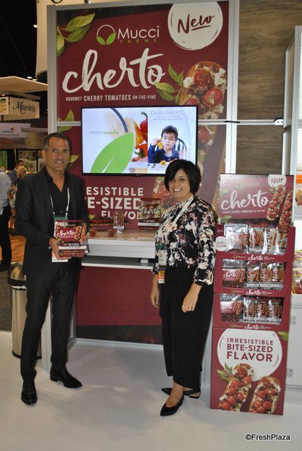 Bert Mucci and Emily Murracas from Mucci Farms are proudly showing the Cherto. They also won two Impact Awards for the Smuccies Sweet Strawberries Top Seal Tray and for the CuteCumber Flow Wrap Re-seal