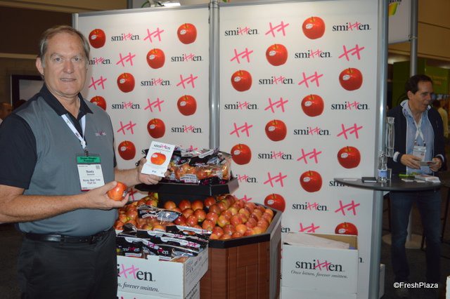 Randy Steensma with Honey Bear Tree Fruit Company showing the Smitten apple.