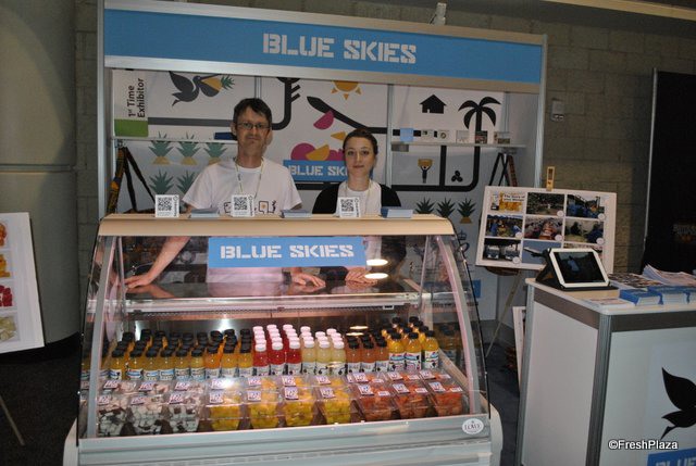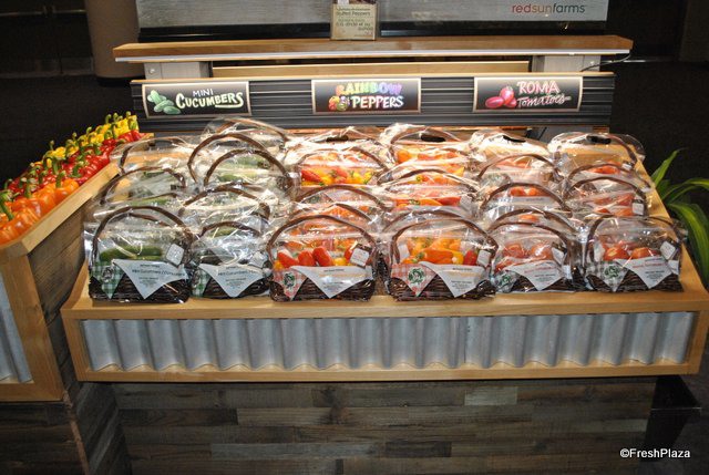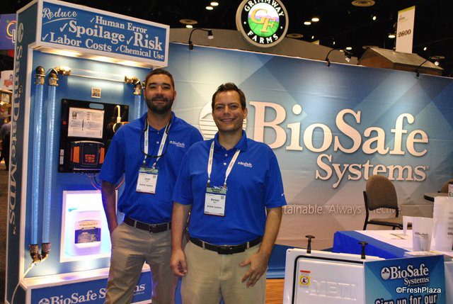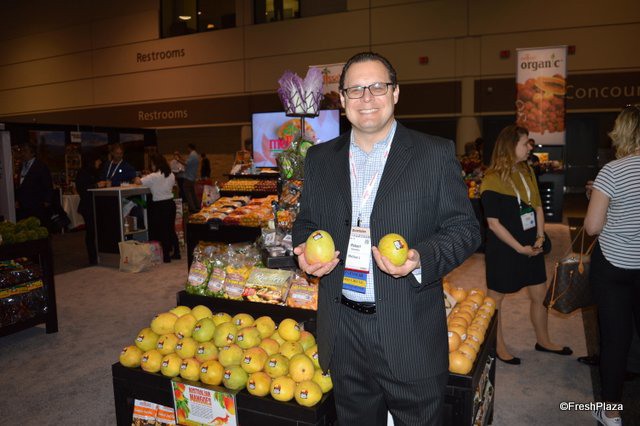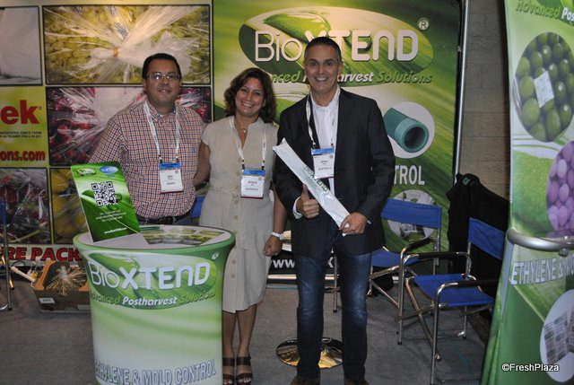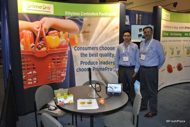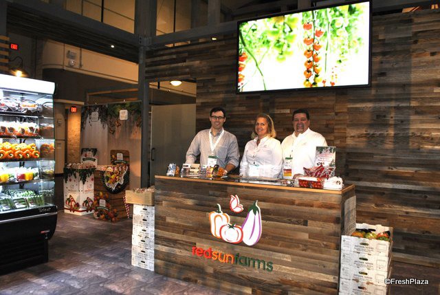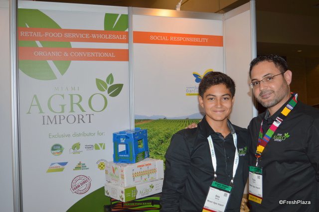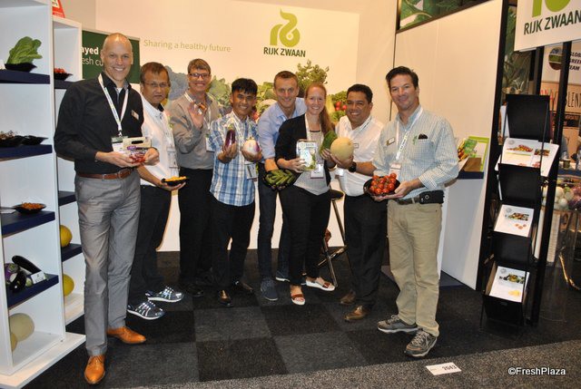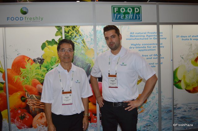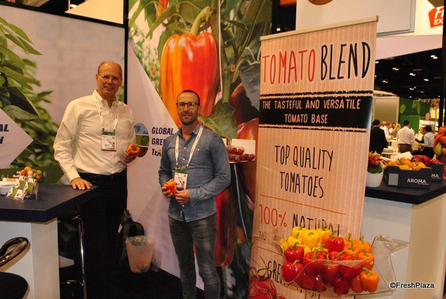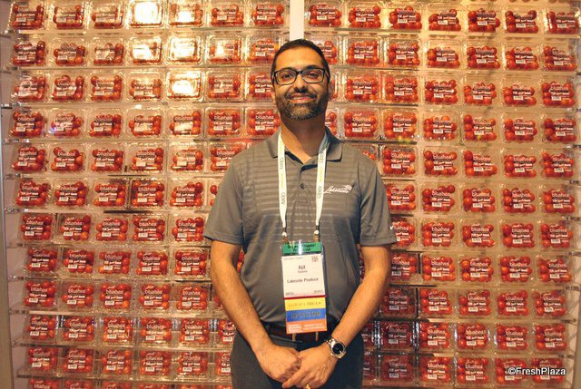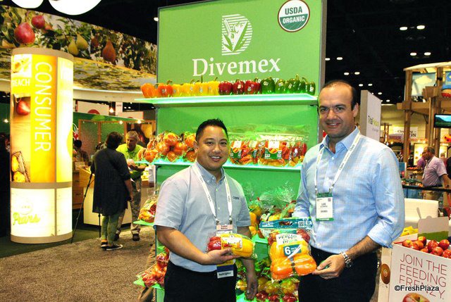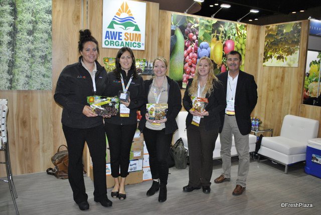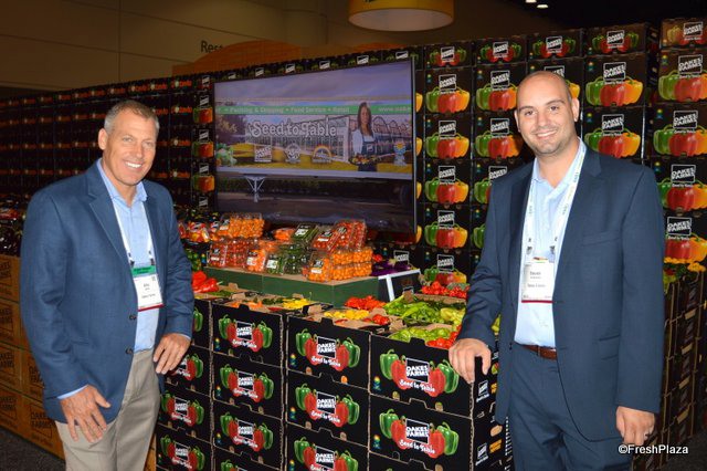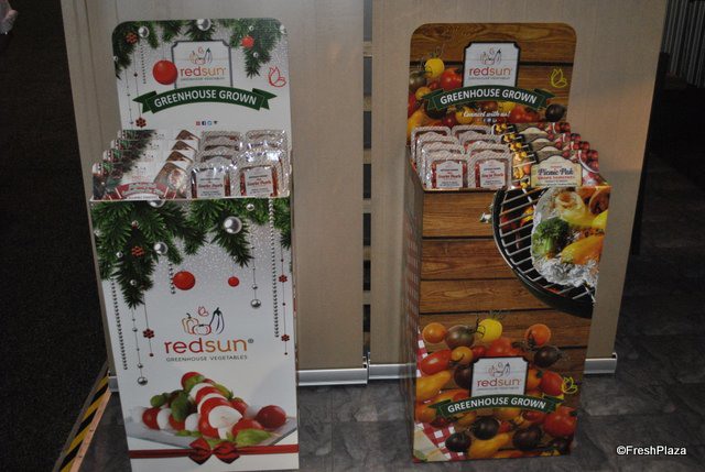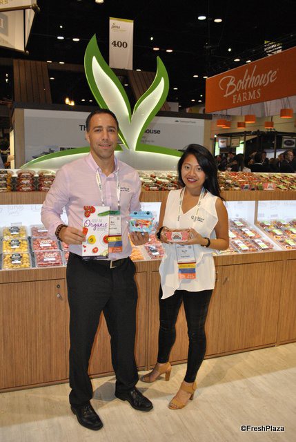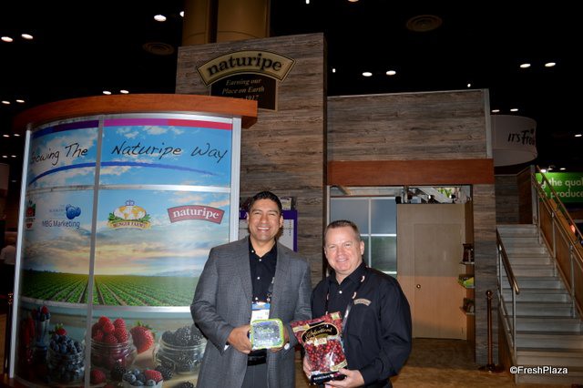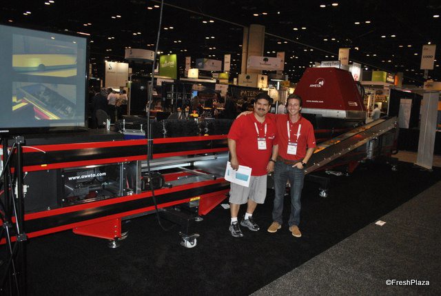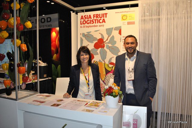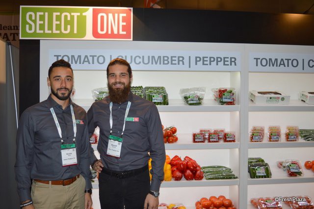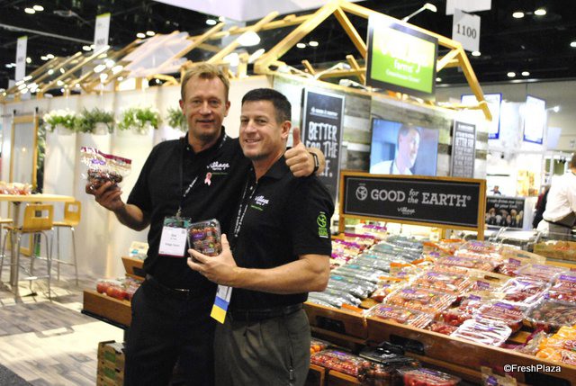 Luis de Saracho (Divemex) and Aaron Quon (Oppy) show their greenhouse produce. With organic produce and a special packing for ugly fruits, they are definitely react to the markets demands.