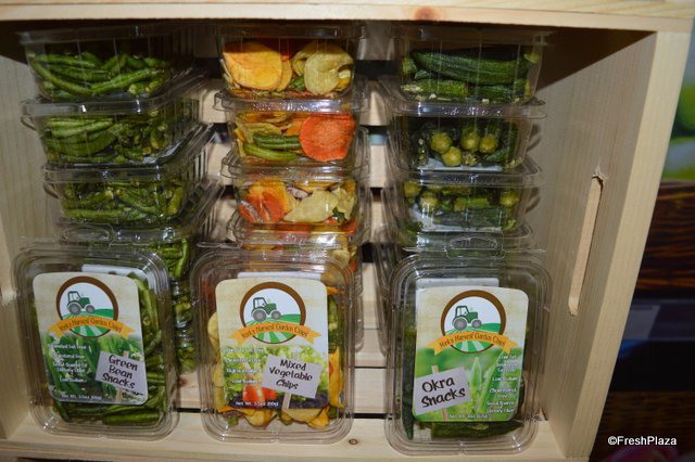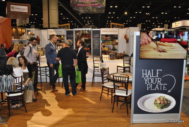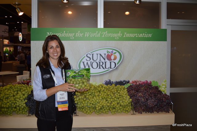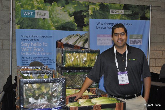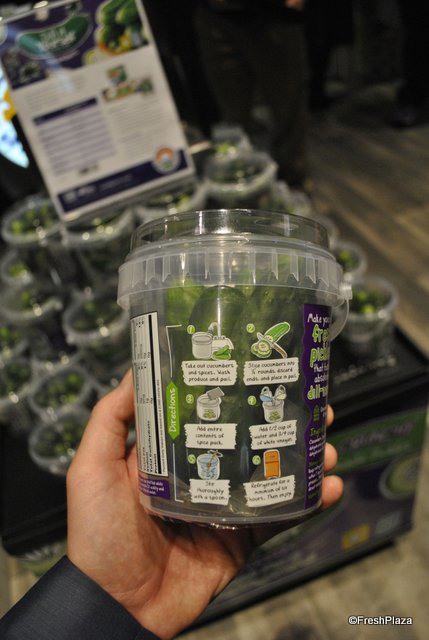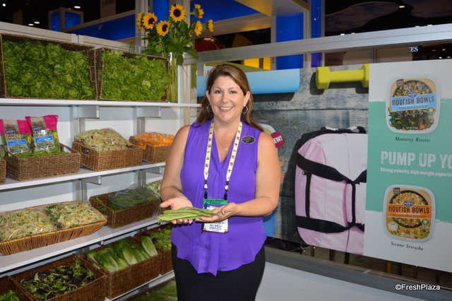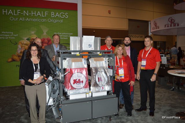 Ken Paglione and Sarah Pau from Pure Flavor promoting the Cloud 9, which was an Award Finalist. The packaging of the tomato is made out of fibers of the tomato plant. Ken holds the Mini Munchies, which is a small bag with Juno Bites grape tomatoes, Aurora Bites mini peppers and Poco Bites cocktail cucumbers. The product receives a lot of interest from schools and foodservice. In the United States it is sold for 99ct.