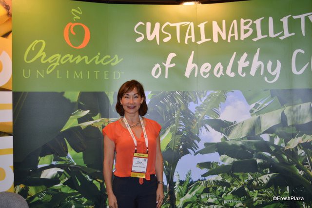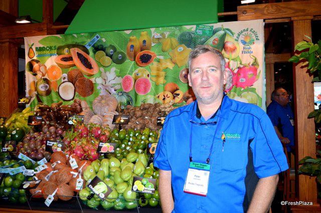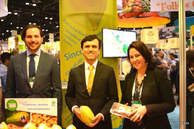 Lorenz Hartmann de Barros, Andres Ocampo and Melissa Hartmann de Barros with HLB Specialties. Organic Formosa papayas are extremely popular. Melissa is showing rambutans in clamshell.