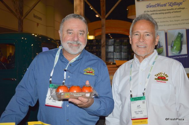Jose Marrero with Farm Stand Fresh Foods and Jeff Trickett with Bejo Seeds, showing organic Tasti-Lee tomatoes.