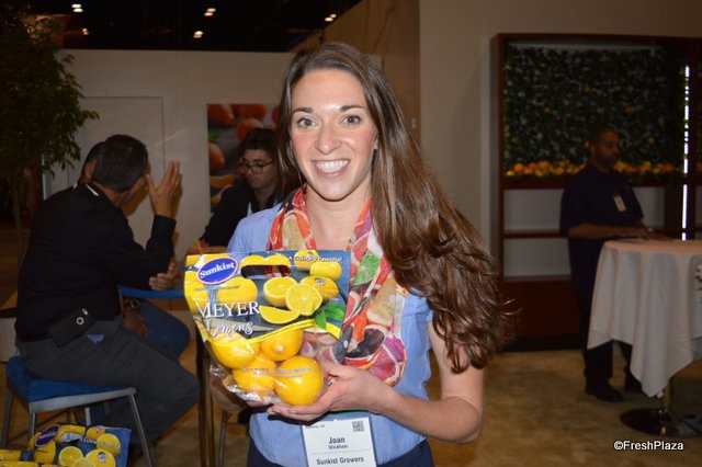 Joan Wickham with Sunkist, showing the new 1 lb. Meyer-lemon bags.