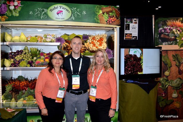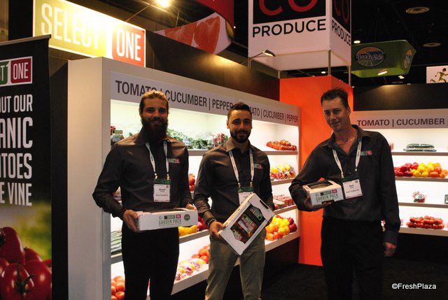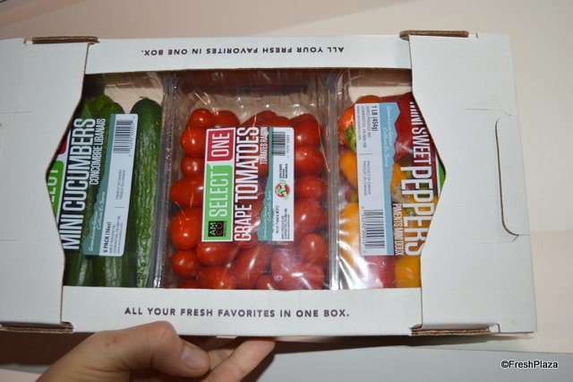 Mark Weese, Michell Amicone and Nicholas Hanna of Arco Produce, showing the new Select One Garden Pack, containing mini cucumbers, mini sweet peppers and grape tomatoes