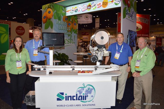 Maria Montalvo, Mark Reed, Chris Faxon and Willard Shay from Sinclair surrounding the POD (Print on Demand) machine. The machine recognizes the fruit or vegetable variety. It prints the PLU and variety/brand on the label.