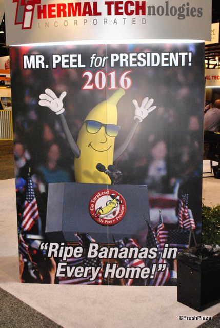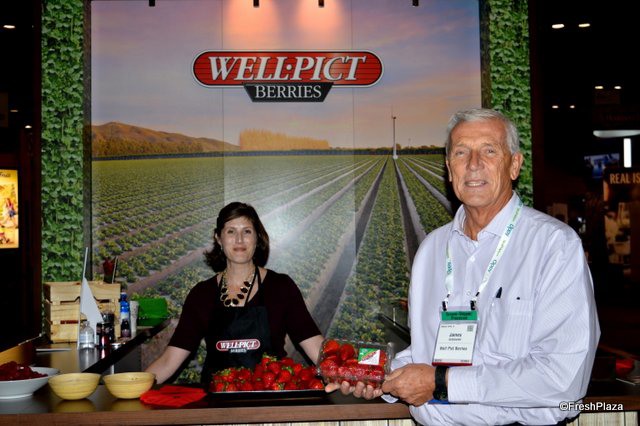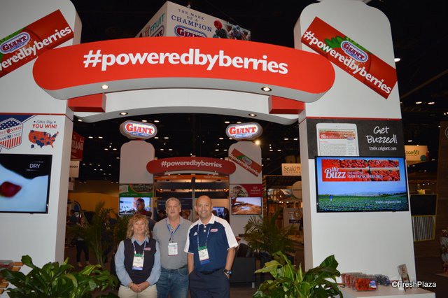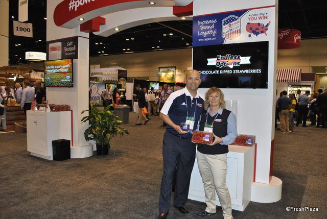 Serjio Sanchez and Sandy J. Jurach from California Giant Berry Farms. They give visitors the chance to start with the election, but on berries. Red for strawberries and Blue for blueberries.